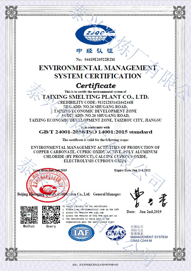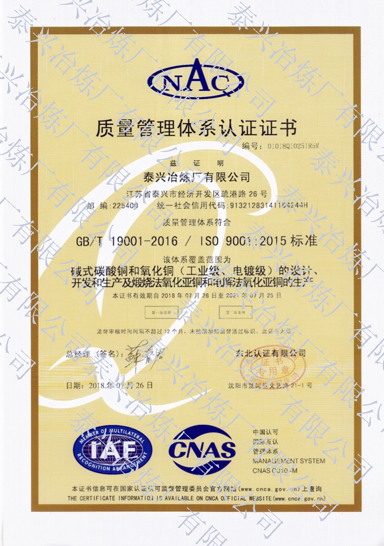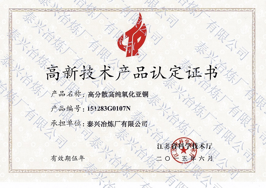 泰興冶煉廠有限公司(原泰興冶煉廠),始建于20世紀70年代初,現位于江蘇省泰興經濟開發(fā)區(qū)。歷經40年的創(chuàng)新驅動、穩(wěn)健發(fā)展,已成長為一家專業(yè)生產堿式碳酸銅、高純電鍍氧化銅、氧化亞銅、氧化銅、無水硫酸銅、海綿銅粉及副產品聚氯化鋁(凈水劑)等系列無機鹽產品及處置不含氨的氯化銅蝕刻液(HW22)15000噸/年的“國家高新技術企業(yè)”和地方性骨干企業(yè)。公司總占地面積3.7萬平方米,建筑面積4萬平方米,注冊資本2088萬元,固定資產1.2億元,年產值約7億元。